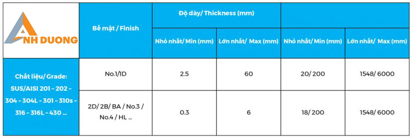 Sản phẩm tấm inox tại Inox Ánh Dương bao gồm các mác thép phổ biến như: